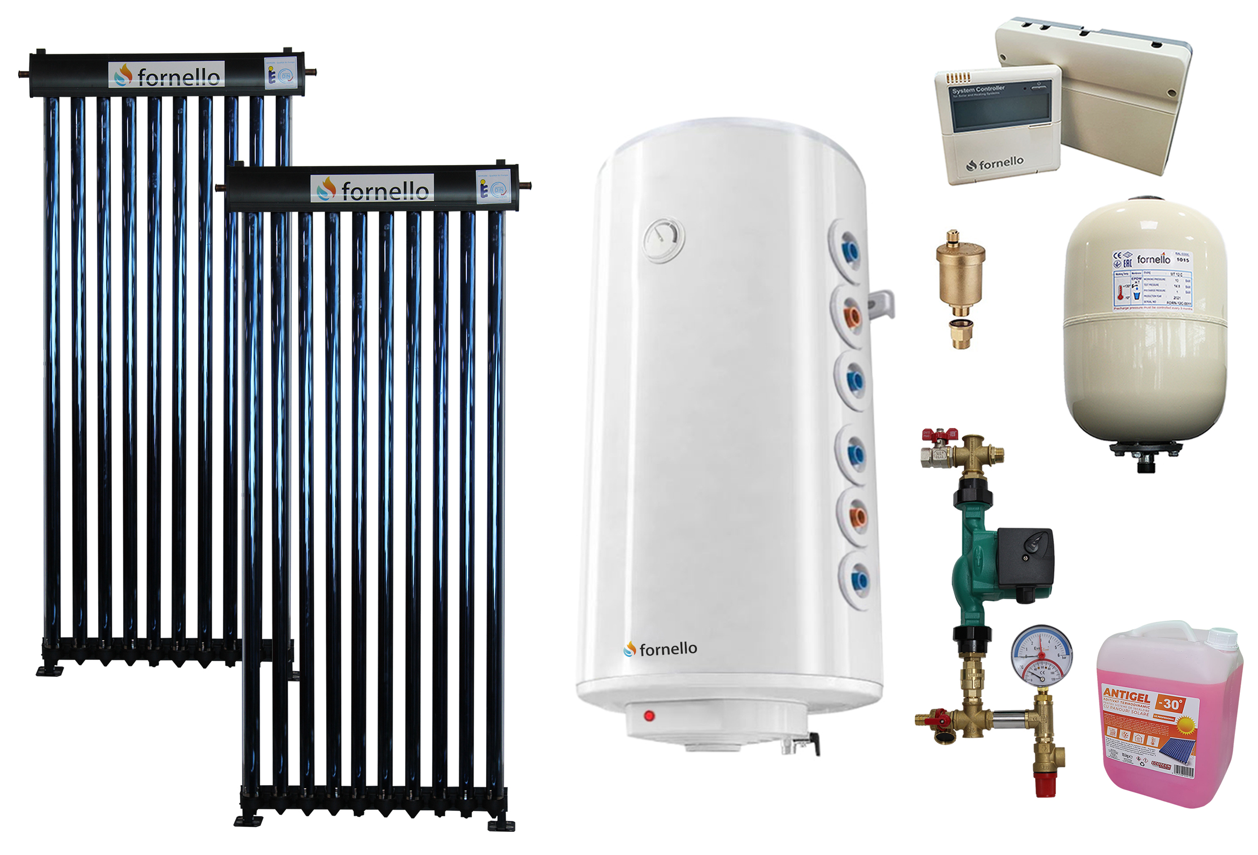 Pachet sistem solar presurizat, panou Fornello 20 Tuburi Heat Pipe, Boiler cu 2 serpentine Fornello Optima GCV7/4S 120 l, controller, vas expansiune, grup pompare, aerisitor 1/2, antigel
