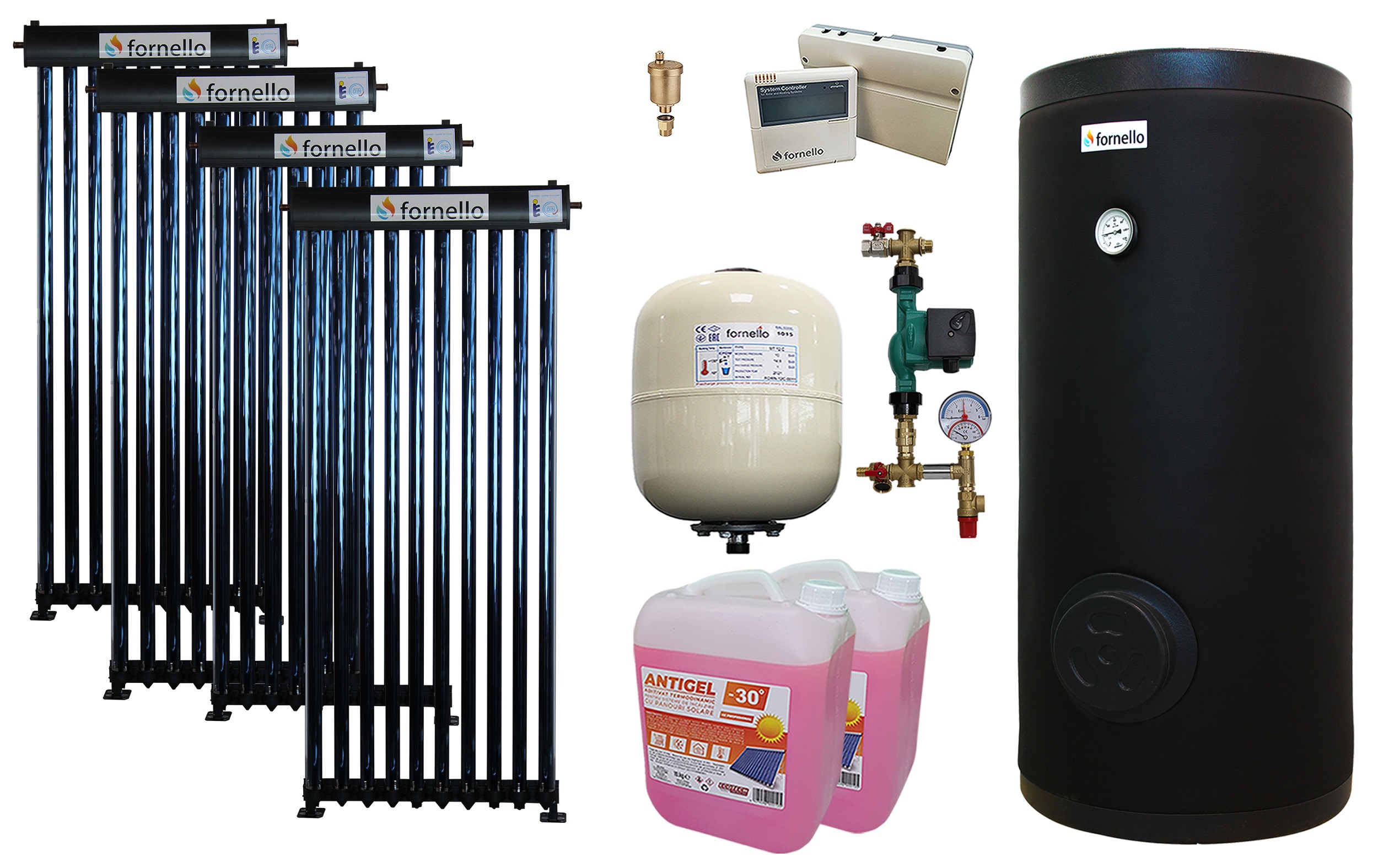 Pachet sistem solar presurizat, panou Fornello 40 Tuburi Heat Pipe, Boiler cu 2 serpentine Fornello SOL 300 LT 2S, controller, vas expansiune, grup pompare, aerisitor 1/2, antigelCaracteristici:-Panourile solare split nu necesita montarea boilerului pe acoperis, boilerul poate fi pozitionat oriunde in locuinta, rezultand o pierdere minima de caldura pe timp racoros-Panoul solar cu boiler bivalent a fost optimizat pentru a furniza apa calda menajera tot timpul anului-O serpentina se monteaza la panoul solar, cea de a doua serpentina se monteaza fie pentru aport la incalzire, fie la o alta sursa aditionala pentru a incalzi apa menajera din boiler-Poate fi montat pe orice tip de acoperis si pe orice suprafata plana-Circuitul de schimb termic (intre panou si boiler) contine agent termic pe baza de antigel, astfel ca poate fi folosit si pe timp de iarna-Instalatiile de panouri solare cu tuburi vidate heat-pipe aduc economie de 80% la apa calda menajera si 30% la incalzireSistemul solar include:1. 4x Panou colector solar presurizat cu tuburi vidate Heat Pipe Fornello 10 tuburi, destinat producerii de apa calda menajera, montaj pe acoperis si fixare suprafata plana2. Boiler cu 2 serpentine FORNELLO SOL 300 LT 2S, pentru centrala termica si solar, montaj pe sol, izolatie termica, manta de protectie , flansa de vizitareCapacitate 300 litriIzolare de inalta eficienta si Husa speciala din piele winlexMontare multipozitie a senzorului de temperatura.Montaj usor.Gura de vizitare.Schimbator de caldura cu serpentine asigura posibilitatea folosirii de surse de caldura independente.Igienic și rezistent la coroziune (abraziune) pe email de titan adăugat de 250-450 microni,grosime 30 mm și poliuretan dur cu densitate 44 kg/m3 la produse de la 100 lt la 500 lt, de la800 lt până la 3000 lt produse cu grosimea de 50 mm și izolație poliuretanică moale de 23 kg/m3.Protectie catodica cu tija anod de magneziuculoare negru, aspect simplu si elegant3. Automatizare solara cu 3 senzori de temperatura (1 senzor pentru panou solar, 2 senzori pentru boiler) -Automatizarea solara are rolul de a comanda pompa solara din grupul de pompare-Dotata cu 3 senzori de temperatura (temperatura de la colectorul solar, temperatura din partea de sus a boilerului, respectiv din partea de jos a boilerului)-Microprocesor pentru monitorizarea si controlul colectorului solar, boilerului si pompei de recirculatie.-Display LCD care indica starea de functionare a instalatiei solare-Functii suplimentare: controlul diferentelor de temperatura; temperatura limita, maxima si minima a colectorului solar; temperatura anti-inghet; temperatura maxima de stocare apa calda menajera; racire; functie anti-legionella; functie by-pass; functie de recirculare; mod vacanta (racire);mod manual4. Vas de expansiune 35 litri5. Grup pompare format din urmatoarele componente:Robinet alama ½” Fi-Fe – 1 buc;Cruce alama ½” – 2 buc;Niplu alama ½” – 6 buc;Reductie alama 1” – ½” – 2 buc;Pompa circulare – 1 buc;Olandezi pompa – 2 buc;Supapa sens alama ½” – 1 buc;Robinet golire alama ½” – 1 buc;Prelungitor ½” 40 mm Fi-Fe – 1 buc;Teu alama ½” – 1 buc;Termomanometru ½” vertical – 1 buc;Supapa siguranta 6 bar – 1 buc;6. Aerisitor automat7. Antigel solar preparat 20 kg-Antigel solar pentru instalatii solare propilen glicol aditivat-Temperatura de lucru: -28°C / 180°CPanou colector solar presurizat cu tuburi vidate Heat Pipe Fornello 10 tuburi, destinat producerii de apa calda menajera, montaj pe acoperis inclinat sau fatadaPanourile solare presurizate Fornello sunt panouri solare cu tuburi vidate si tuburi termice (tip heat pipe din cupru pentru o conductivitatea termica foarte buna) montate in interiorul lor. Pot fi folosite in instalatiile de incalzire si de preparare a apei calde de consum menajer pe toata perioada anului.Tubul termic din interiorul tuburilor vidate transforma energia solara in energie termica si o transfera colectorului in care se monteaza toate tuburile termice si care se afla in partea superioara a panoului solar.Agentul termic lichid cu temperatura joasa de vaporizare aflat in interiorul tuburilor termice (heat pipe) este incalzit, se transforma in vapori care se ridica spre partea superioara ingrosata a tubului termic denumita condensator. Vaporii de agent termic condenseaza si isi cedeaza caldura latenta de vaporizare prin condensator catre colectorul panoului solar.Dupa aceea, agentul termic lichid se va intoarce gravitational la partea inferioara a fiecarui tub termic (heat pipe) si ciclul se repeta intr-un mod continuu atata timp cat tubul termic este incalzit de soare.Tuburile vidate din sticlă sunt componenta cheie a colectoarelor solare cu tuburi vidate.Fiecare tub evacuat este format din două tuburi de sticlă. Tubul exterior este realizat din sticla borosilicata transparenta extrem de puternica,capabila sa reziste la impactul cu grindina cu un diametru de pană la 25 mm. si tubul interior este facut tot din sticlă borosilicat, invelita cuun strat special (Al-N/CU), cu proprietati excelente in absorbtia caldurii solare si minima reflexie. Aerul este vidat din spatiul dintre celedoua tuburi de sticla pentru a forma un vacuum,care elimina pierderea de caldura conductiva si convectiva.Teava Heat Pine reprezinta doua tevi dispuse concentric cu vacuum intre ele. Suprafata tevii interioare este acoperita cu un strat selectiv, ce permite o absorbtie maximala a razelor solare, pierderi minimale si un coeficient de performanta (COP) inalt. In centrul tevei Heat Pipe se afla o teava mica de cupru goala , in care se initiaza procesele de evaporare a unui fluid netoxic, care preda temperatura spre varful ei si o trimite catre nodul colector, de unde se incalzeste agentul termic. Procesele se repeta din nou si din nou.AVANTAJELE PANOURILOR SOLARE PRESURIZATE CU TUBURI TERMICE (HEAT PIPE):nu exista pericolul de spargere pe timpul iernii (deoarece tuburile termice nu contin apa ci un agent 